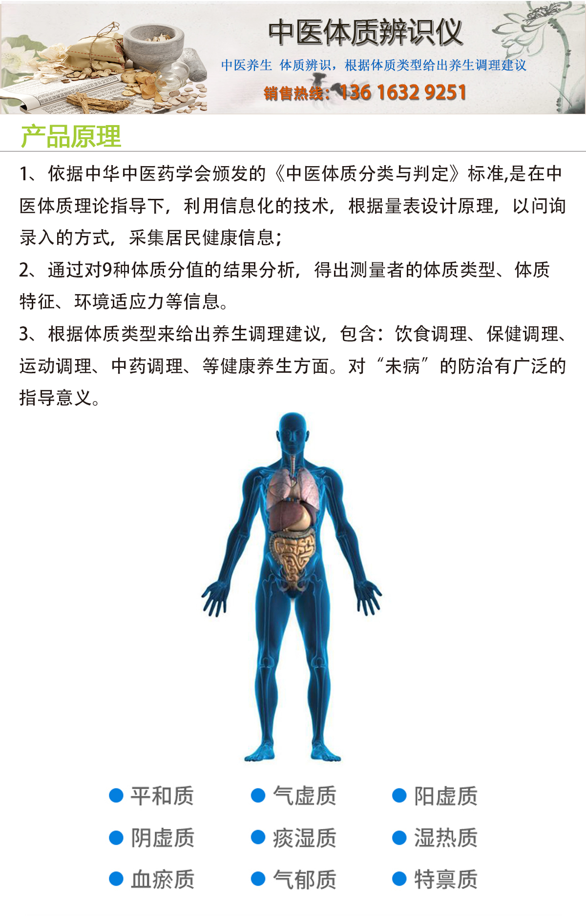 检测项目:平和质、阳虚质、气虚质、痰湿质、阴虚质、血瘀质、气郁质、特禀质