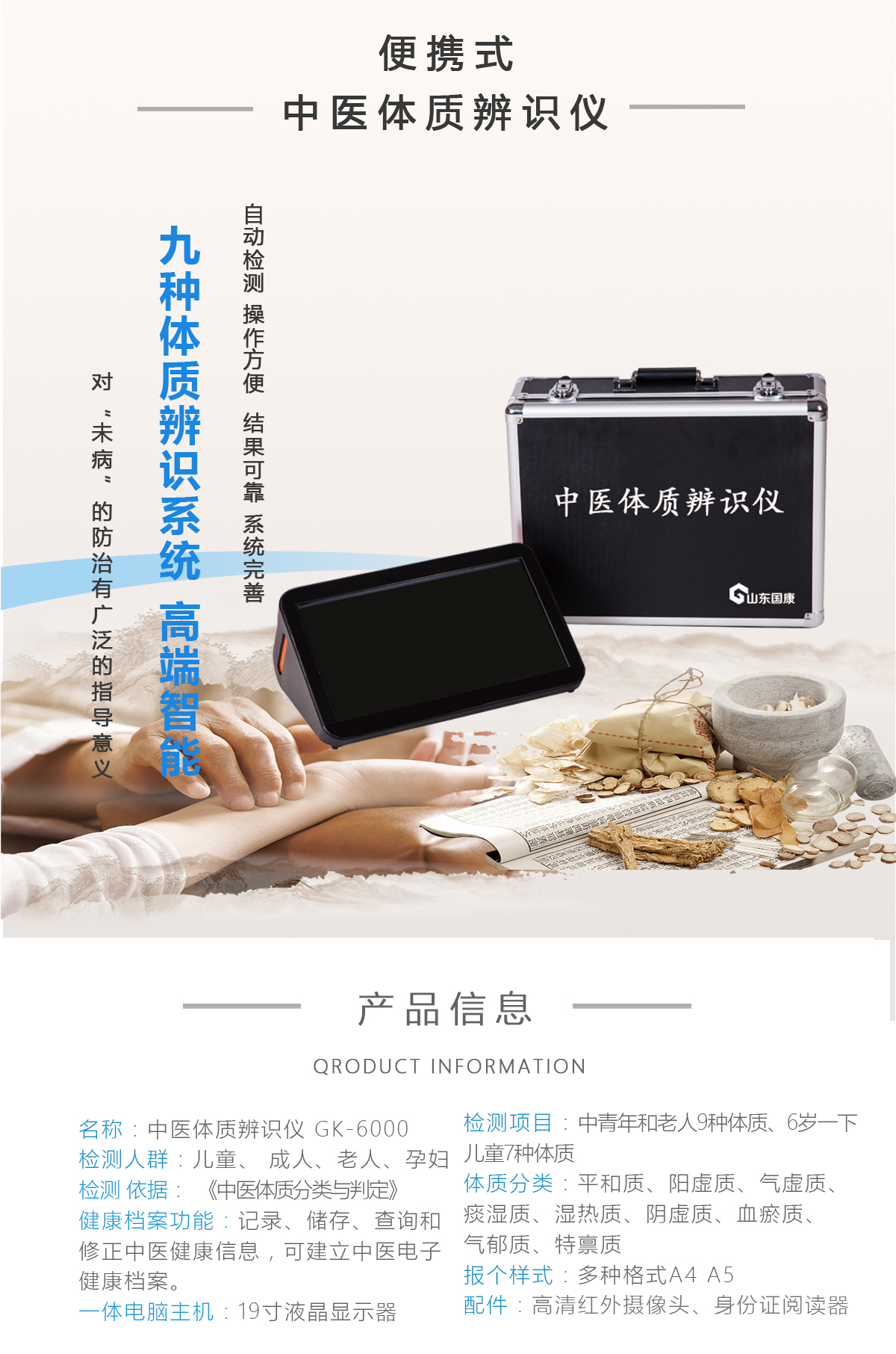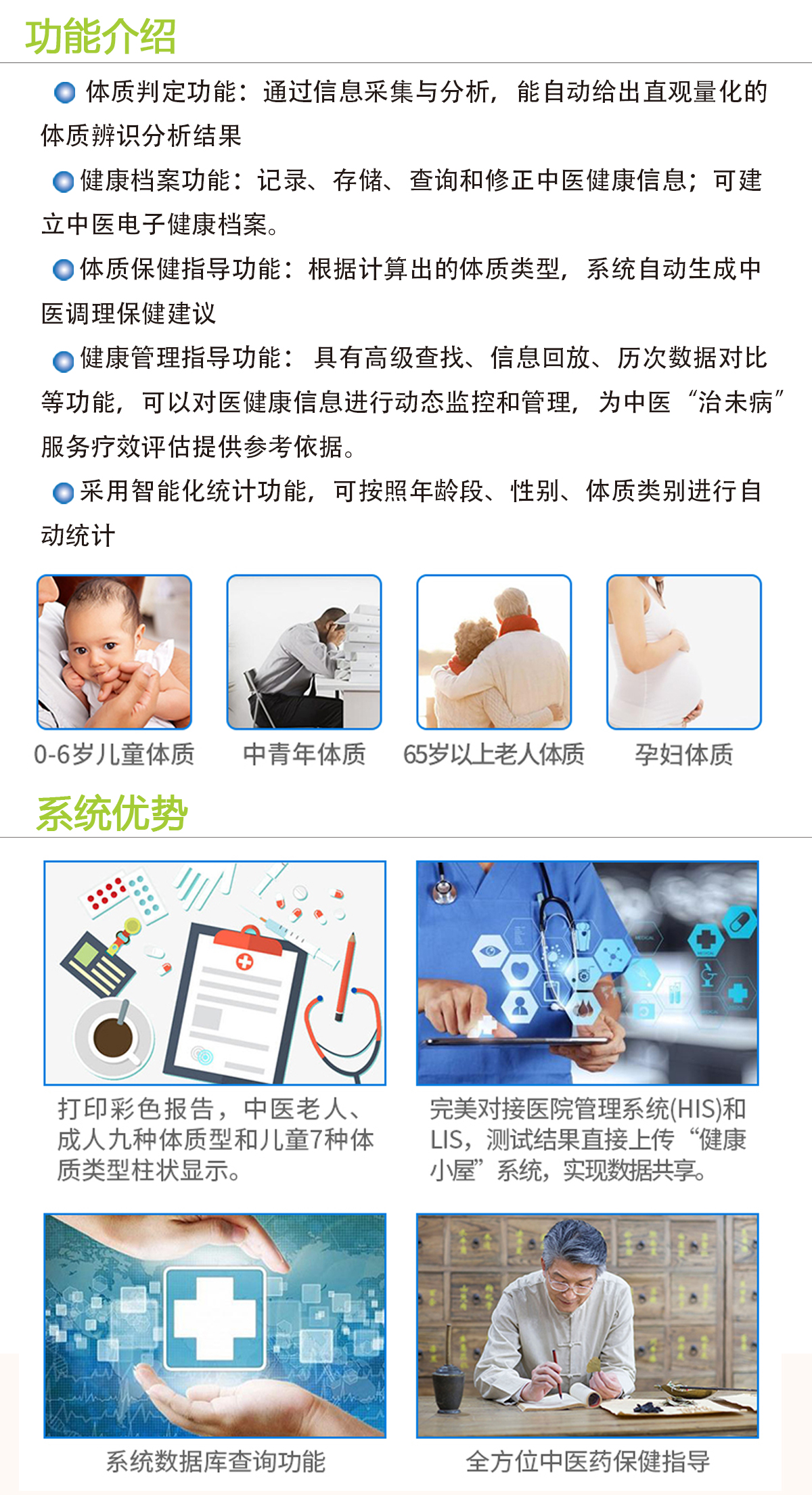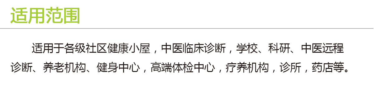 产品用途: 适用于各级社区健康小屋,中医临床诊断,学校、科研、中医远程 诊断、养老机构、健身中心,高端体检中心,疗养机构,诊所,药店等。
